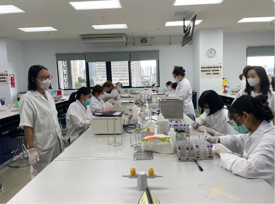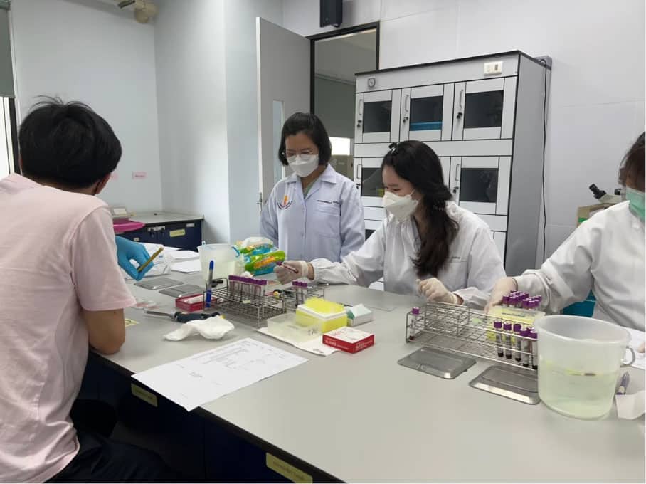 คณาจารย์ในภาควิชาเวชศาสตร์การธนาคารเลือดฯ และนิสิตเทคนิคการแพทย์ช่วยดำเนินการนำเลือดมาตรวจหมู่เลือด ด้วยวิธีมาตรฐาน ณ ห้องปฏิบัติการภาควิชาเวชศาสตร์การธนาคารเลือด