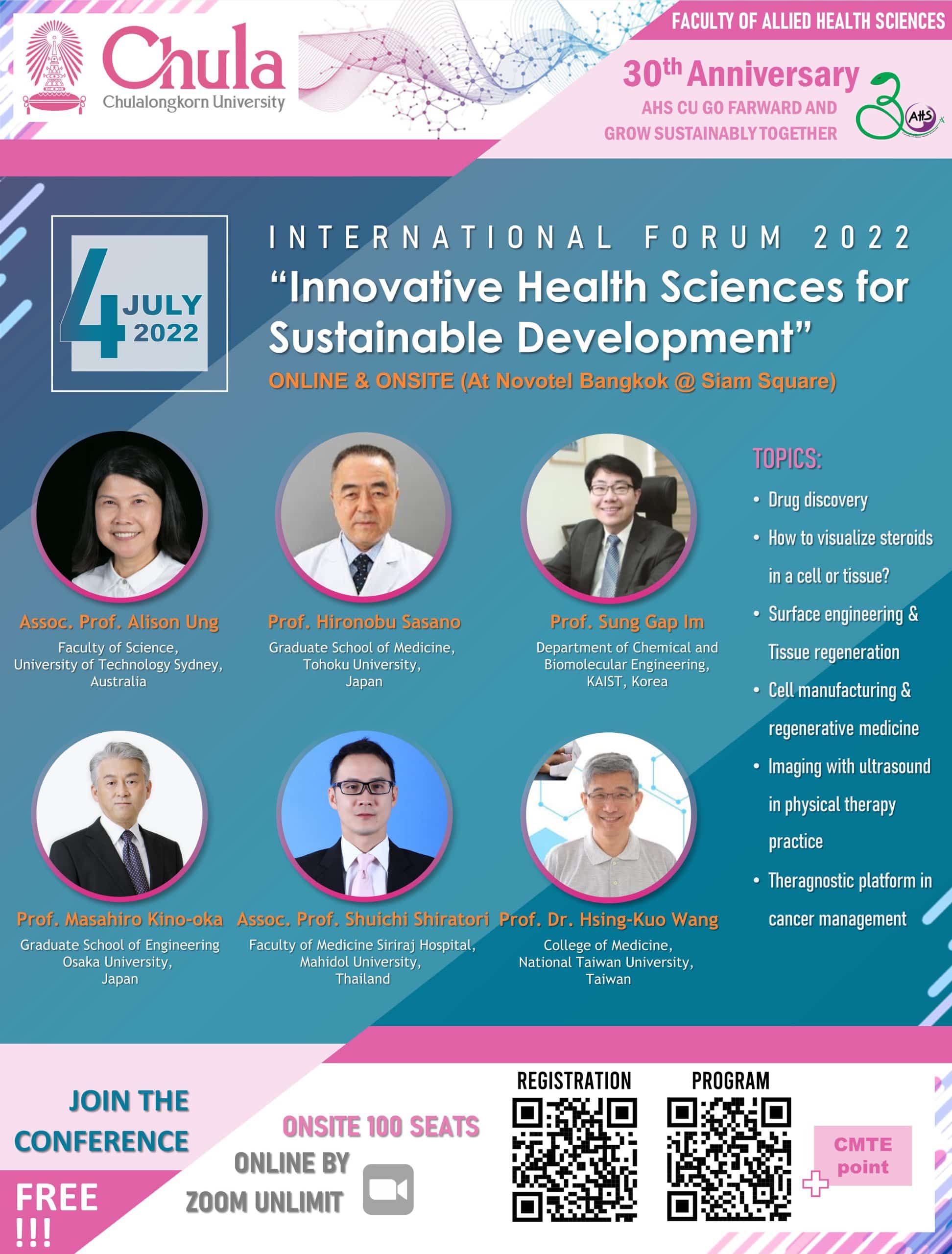 ในโอกาสครบรอบ 30 ปี คณะสหเวชศาสตร์ จุฬาลงกรณ์มหาวิทยาลัยขอเชิญผู้ที่สนใจทุกท่าน เข้าร่วมสัมมนา International Forum 2022 ในหัวข้อ “Innovative health sciences for sustainable development”