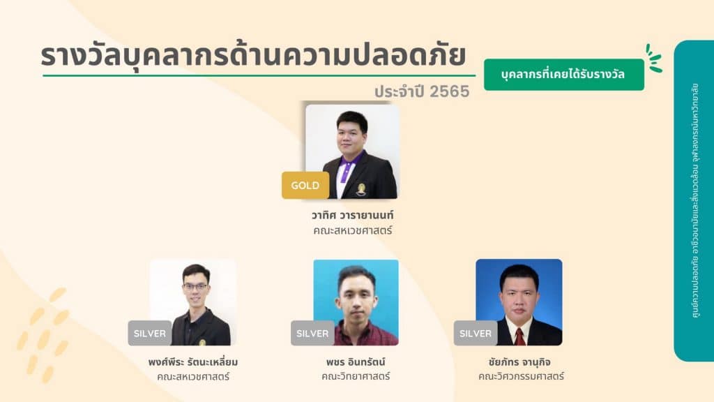 ภายใต้โครงการประกวดส่วนงานด้านความปลอดภัย” ประจำปี พ.ศ. 2565 ที่จัดขึ้นโดย ศูนย์ความปลอดภัย อาชีวอนามัยและสิ่งแวดล้อม จุฬาลงกรณ์มหาวิทยาลัย (ศปอส.)